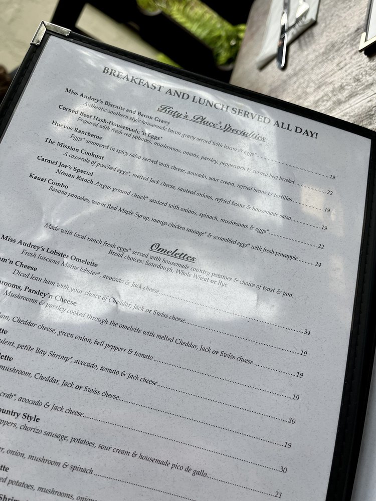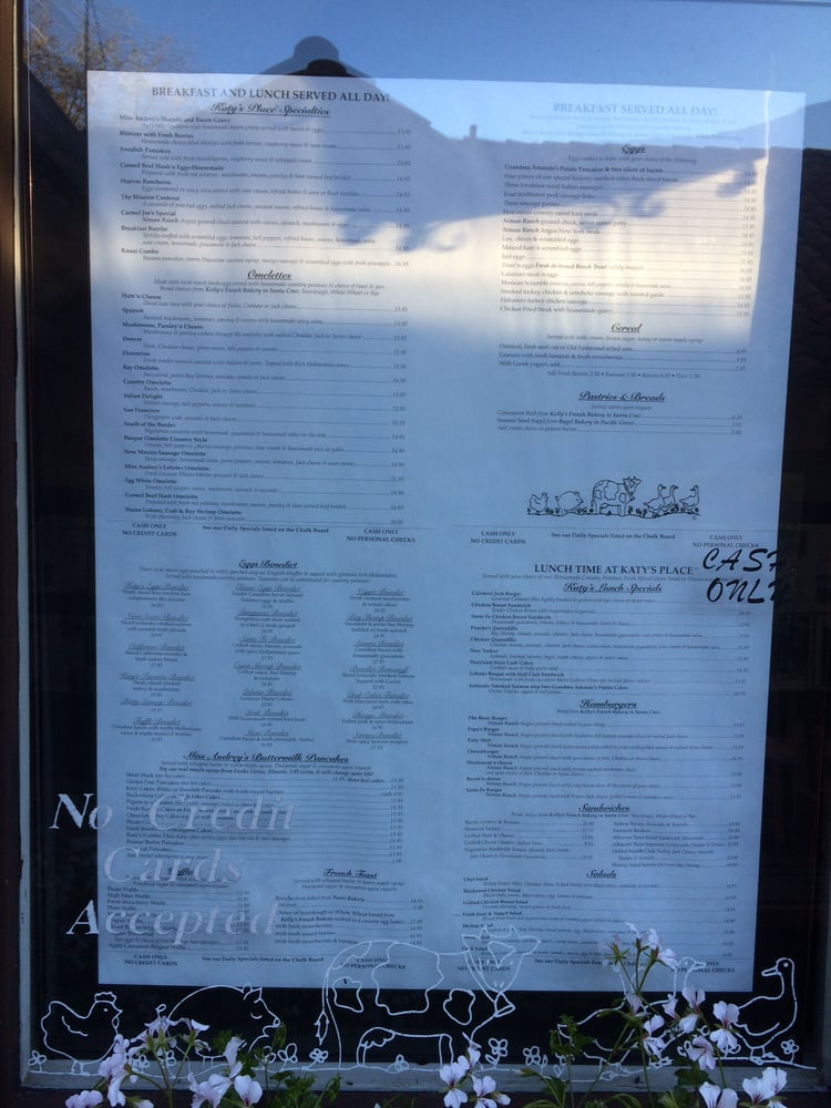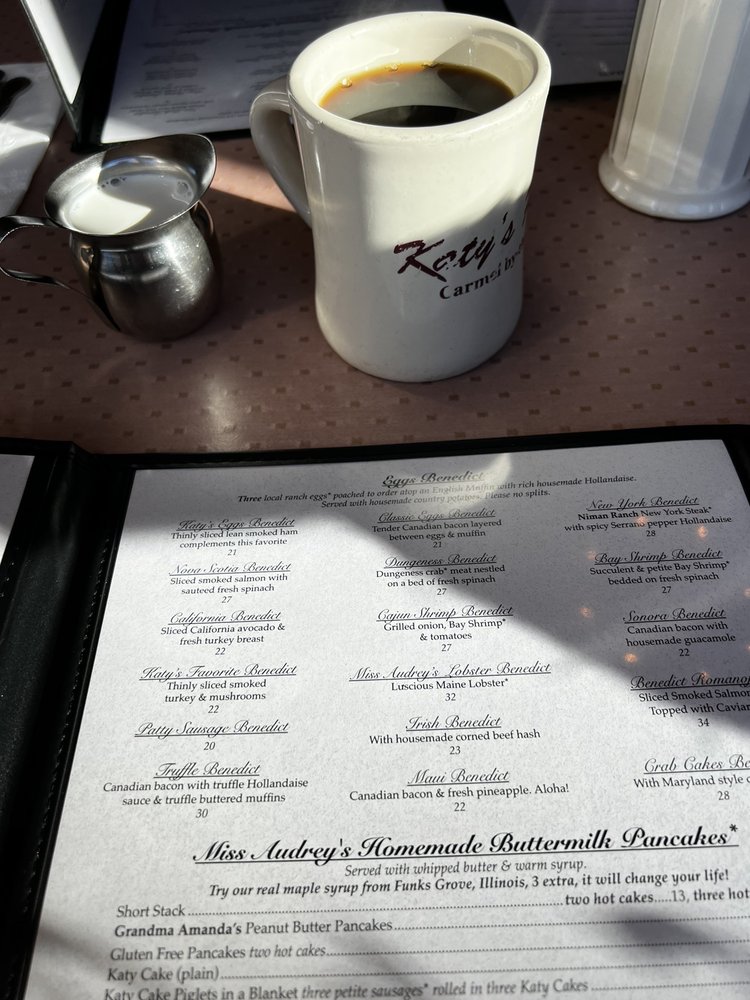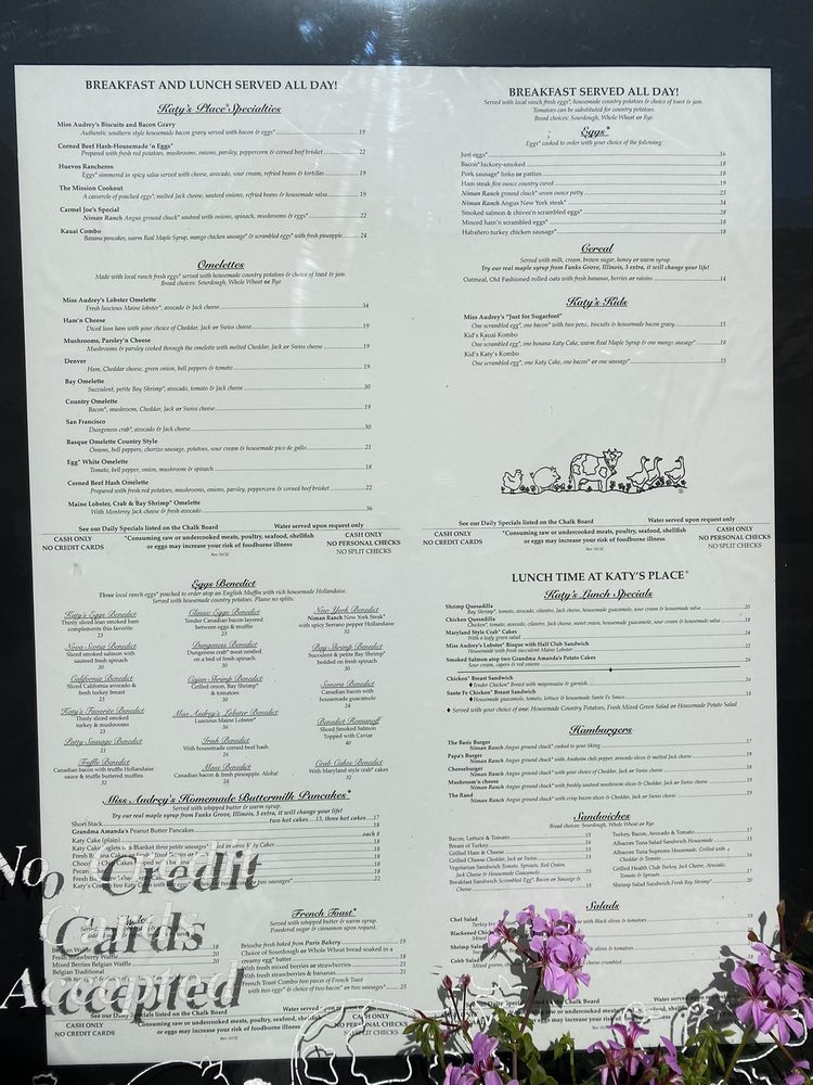 "Katy's Place" on Mission St in Carmel, CA offers a casual dining experience with a range of amenities including reservations, delivery, and outdoor seating. The menu boasts many vegetarian options and a variety of breakfast and brunch dishes. Customers have praised the light and fluffy pancakes, perfectly cooked eggs, and crispy bacon, though some have noted slightly burnt bacon. The cozy atmosphere and friendly service create a welcoming vibe for diners. Highlights include delicious hot apple cider and French toast, as well as a veggie omelette plate with potatoes and bread. Overall, "Katy's Place" is a charming spot for a satisfying breakfast or brunch in Carmel.