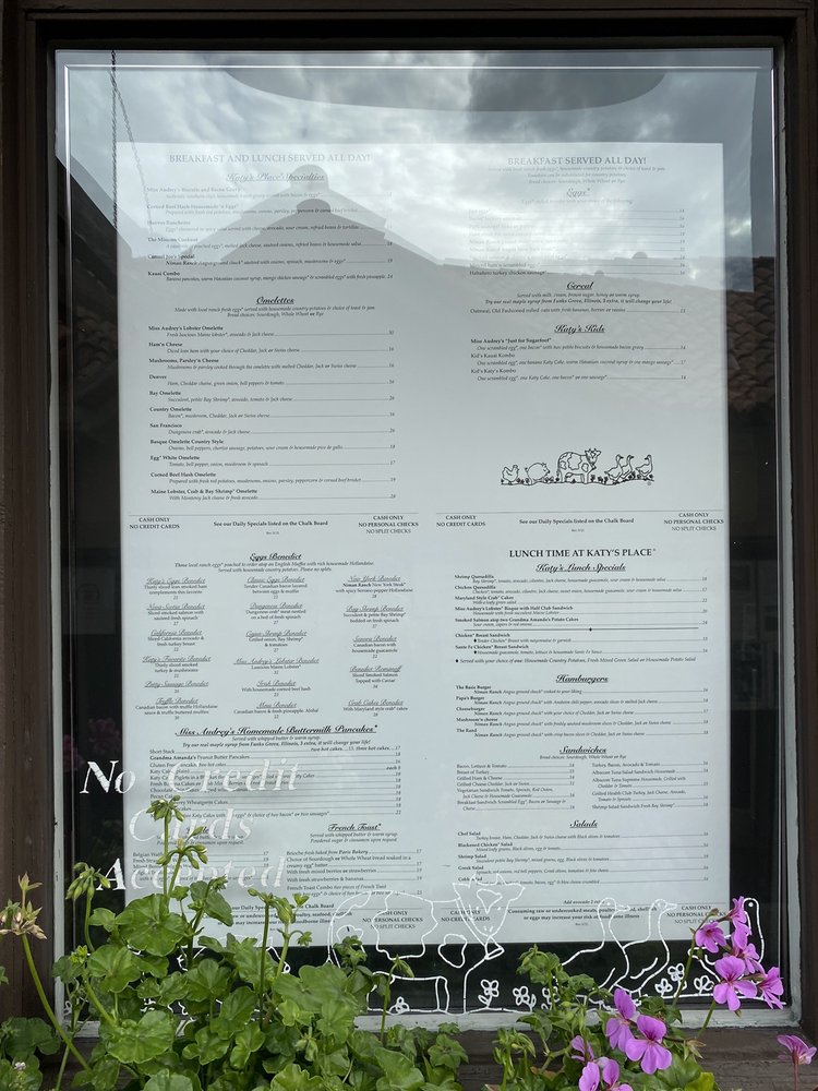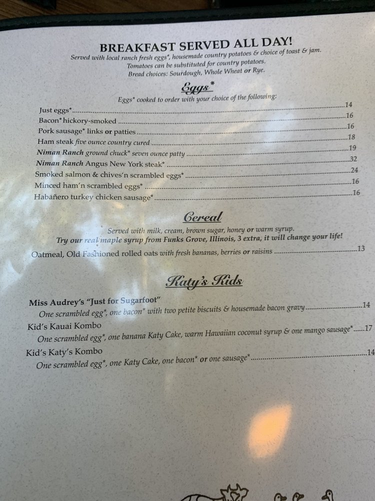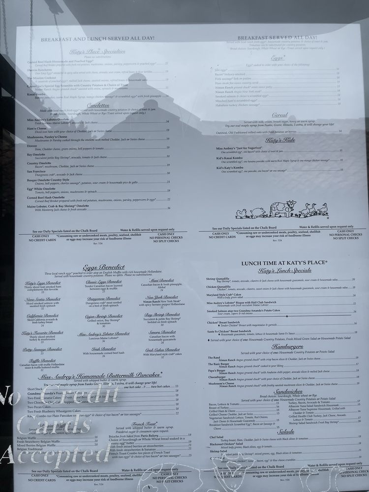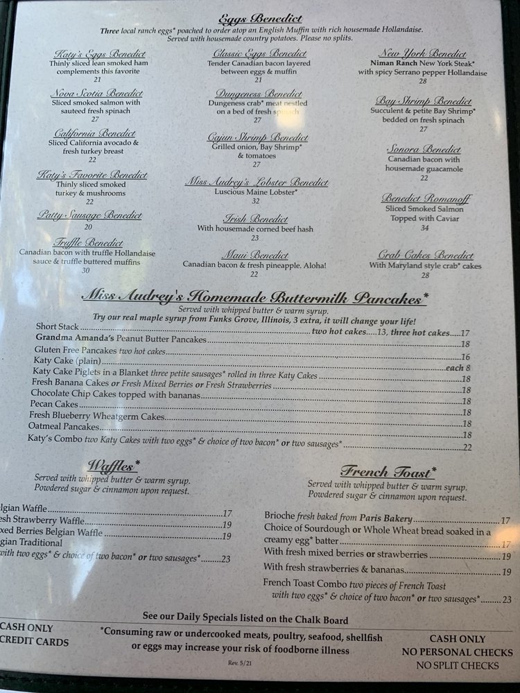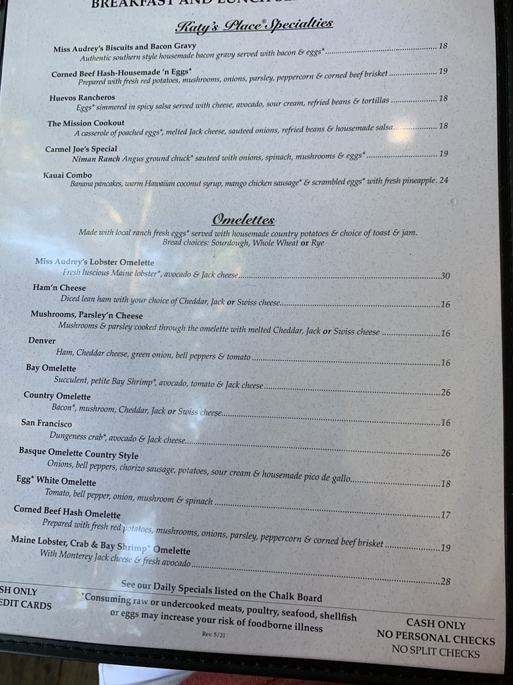 "Katy's Place" on Mission St in Carmel, CA offers a casual dining experience with a range of amenities including reservations, delivery, and outdoor seating. The menu boasts many vegetarian options and a variety of breakfast and brunch dishes. Customers have praised the light and fluffy pancakes, perfectly cooked eggs, and crispy bacon, though some have noted slightly burnt bacon. The cozy atmosphere and friendly service create a welcoming vibe for diners. Highlights include delicious hot apple cider and French toast, as well as a veggie omelette plate with potatoes and bread. Overall, "Katy's Place" is a charming spot for a satisfying breakfast or brunch in Carmel.